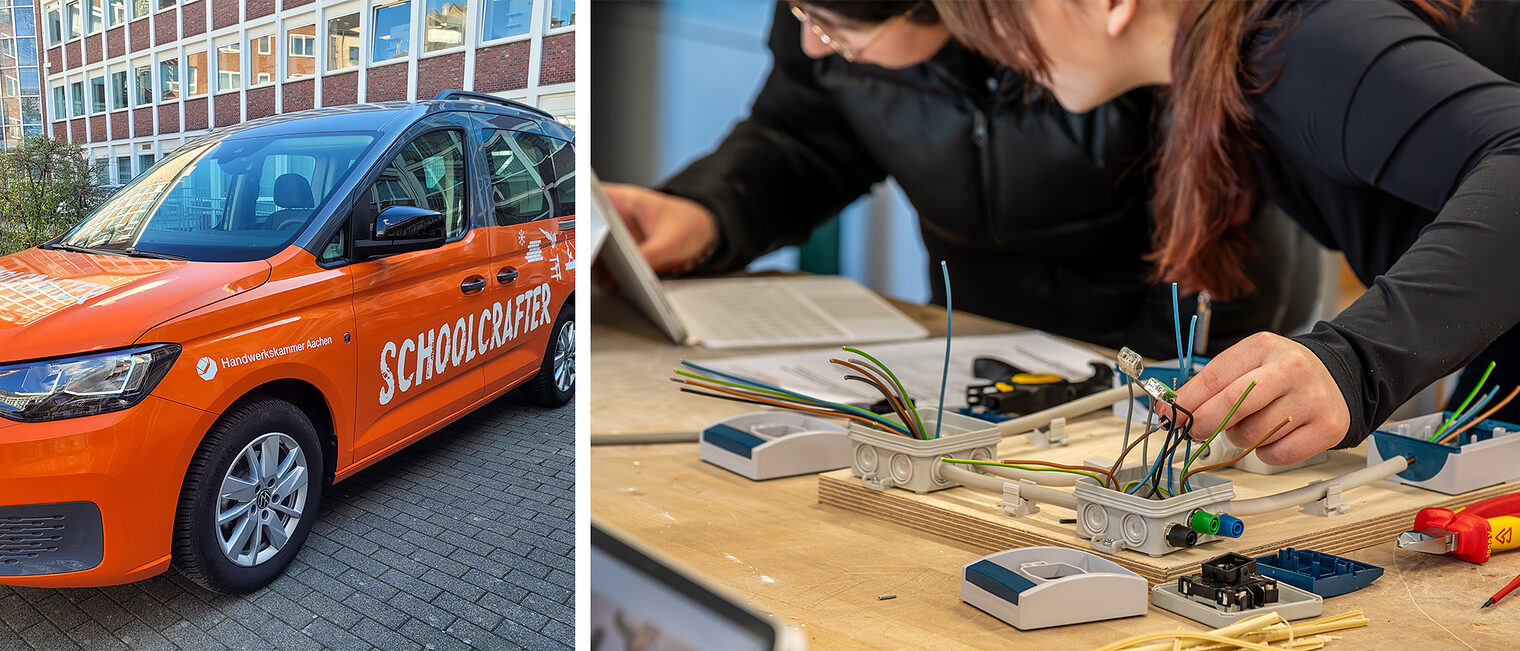 Das sichtbarste Zeichen des Jubiläumsjahrs war der Schoolcrafter. Mit diesem Berufsorientierungsmobil geht die Handwerkskammer Aachen seit März 2025 neue Wege in der Nachwuchsförderung. Ziel ist es, Schülerinnen und Schülern praxisnahe Einblicke in verschiedene Handwerksberufe zu ermöglichen – direkt vor Ort in den Schulen.