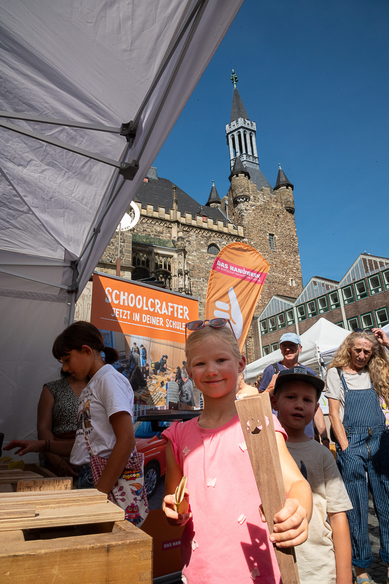 Bei der Aktion „Schlag den Meister“ konnten junge Stadtfestbesucherinnen und -besucher ihre handwerklichen Fähigkeiten im Wettbewerb mit Handwerksmeistern unter Beweis stellen – ein großer Spaß sowohl für die Expertinnen und Experten als auch für die Kinder und Jugendlichen.