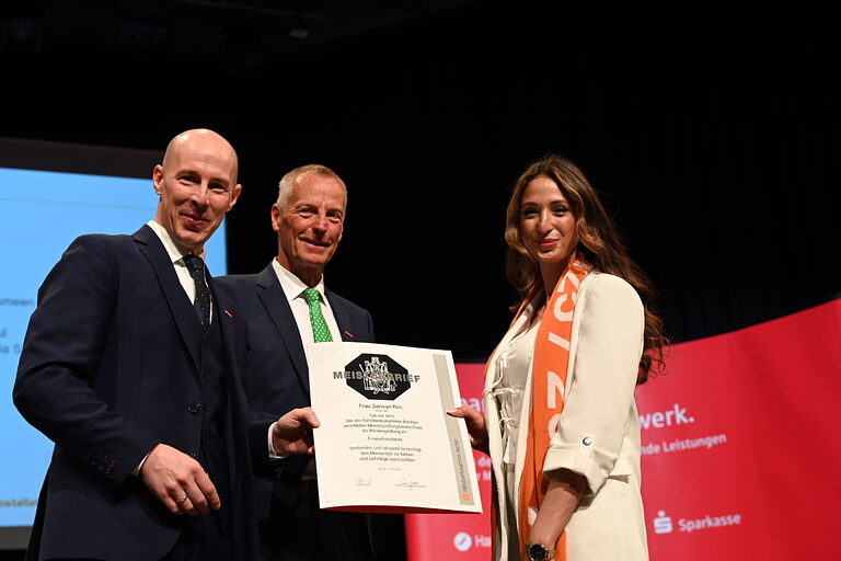 Stolz und Leidenschaft fürs Handwerk prägen die Stimmung bei der Meisterfeier: Hier präsentiert die frisch gebackene Friseurmeisterin Serivan Koc ihren Meisterbrief, HWK-Präsident Marco Herwartz (l.) und Hauptgeschäftsführer Georg Stoffels sind die ersten Gratulanten.