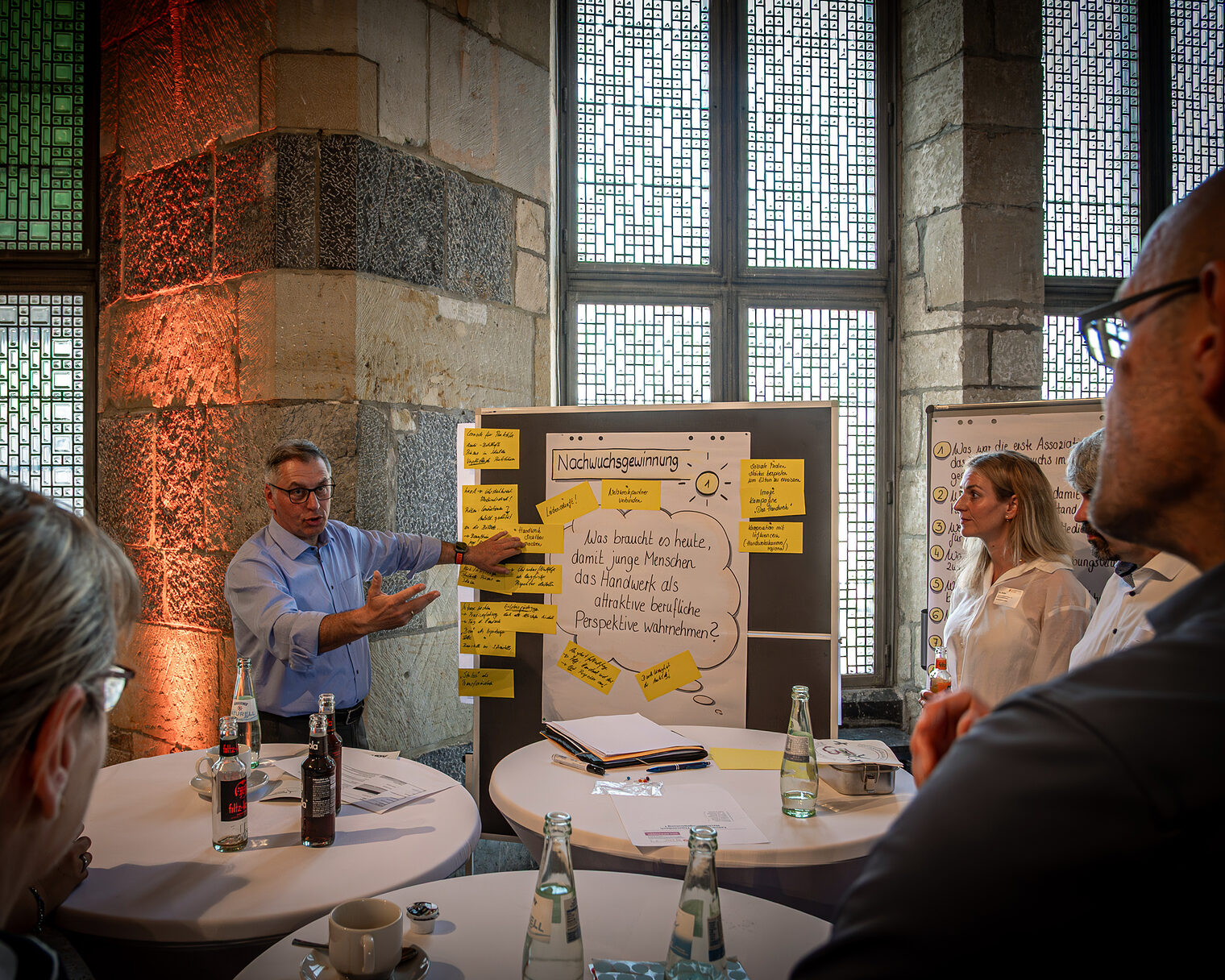 Im Anschluss an die Podiumsdiskussion im Krönungssaal des Aachener Rathauses lud die Handwerkskammer Aachen zu Thementischen ein, bei denen Vertreterinnen und Vertreter des Handwerks sowie der Öffentlichkeit intensiv ins Gespräch kamen. Zur Diskussion standen Themengruppen, die das Heute und Morgen des Handwerks maßgeblich beeinflussen - allen voran die Frage der Nachwuchsgewinnung, die an gleich zwei Tischen Gegenstand der Gespräche war. An den Nachbartischen ging es um die Themen Nachhaltigkeit & Klimaschutz, Außenwirtschaft, Frauen im Handwerk sowie Integration von Migrantinnen und Migranten. Im Anschluss präsentierten die Gruppen ihre Ergebnisse und die Fragestellungen. In einer der kommenden DHB-Ausgaben folgt ein ausführlicher Bericht.