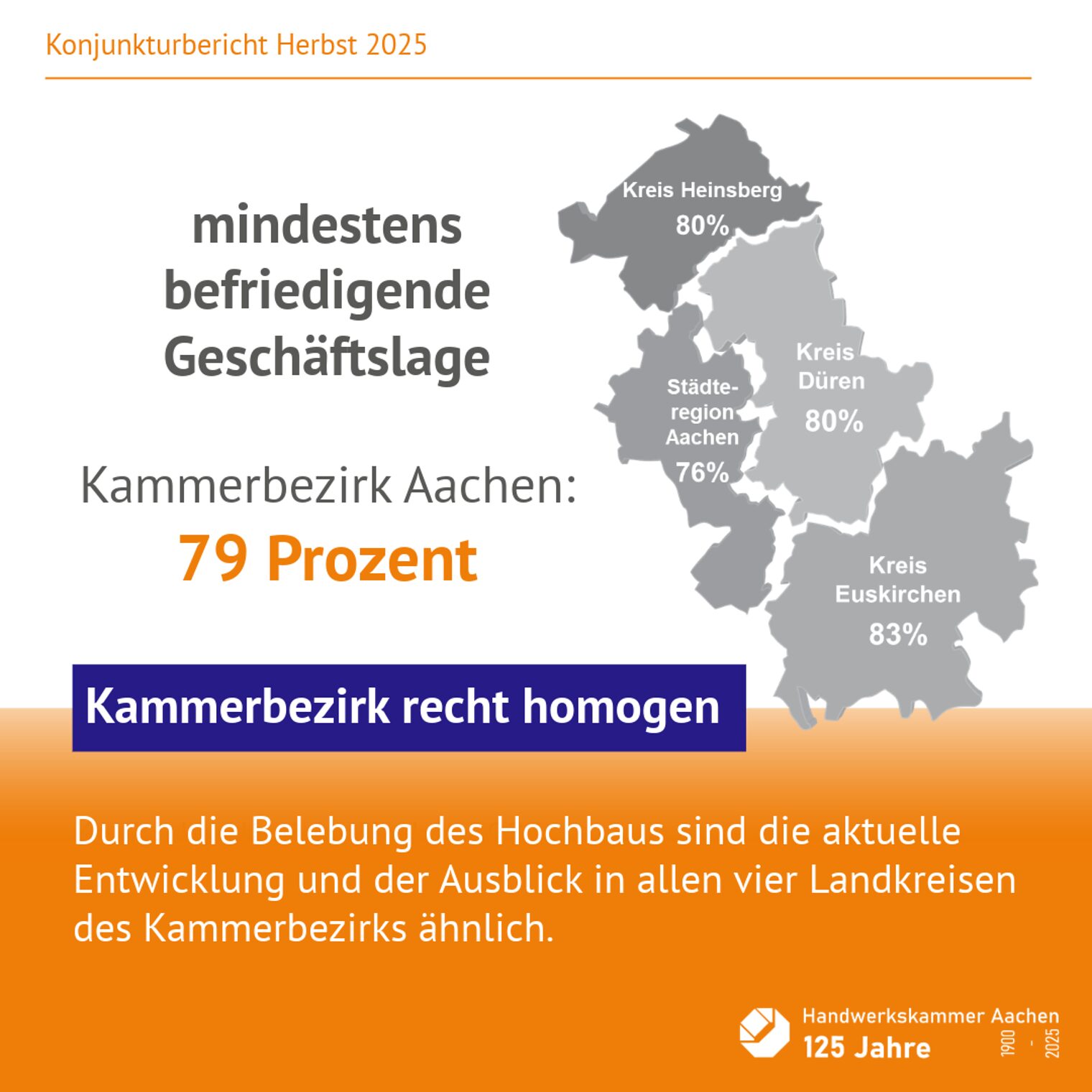 So nimmt der Kreis Euskirchen, der zuletzt oft das Schlusslicht bildete, in der aktuellen Umfrage den Spitzenplatz ein: 83 Prozent der Betriebe bewerten ihre Geschäftslage als gut oder befriedigend. Im Kreis Heinsberg stieg der Wert von 75 auf 80 Prozent, auch im Kreis Düren zeigt sich eine leichte Verbesserung. Dort profitieren viele Betriebe von Aufträgen aus den Ballungsräumen Aachen und Köln sowie der weiterhin starken Industrie. In der StädteRegion Aachen blieb die Lage hingegen weitgehend stabil. Aufgrund der dortigen Handwerksstruktur haben sich die relevanten Kennzahlen kaum verändert – das Oberzentrum hat dadurch seine Spitzenposition der letzten Umfragen aber eingebüßt.