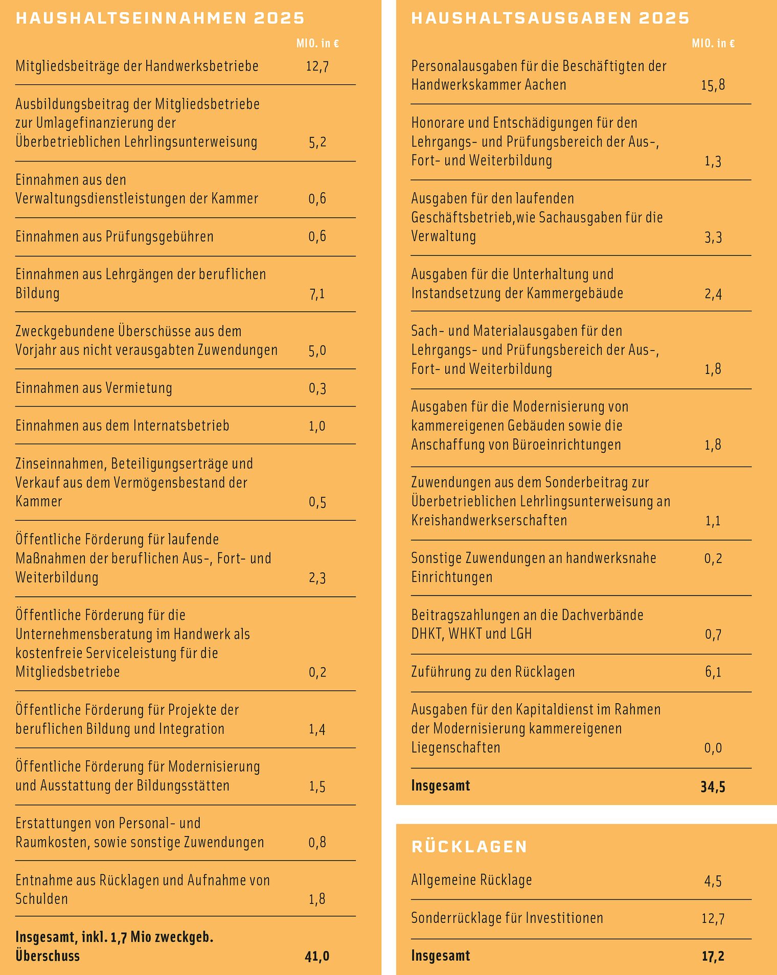 Die Handwerkskammer Aachen handelt dabei mit der Professionalität eines mittelständischen Unternehmens – verbunden mit den besonderen Aufgaben einer Körperschaft des öffentlichen Rechts. Dazu gehören eine verantwortungsbewusste Haushaltsführung ebenso wie eine vorausschauende Investitionspolitik für das Haupthaus und die Bildungszentren.