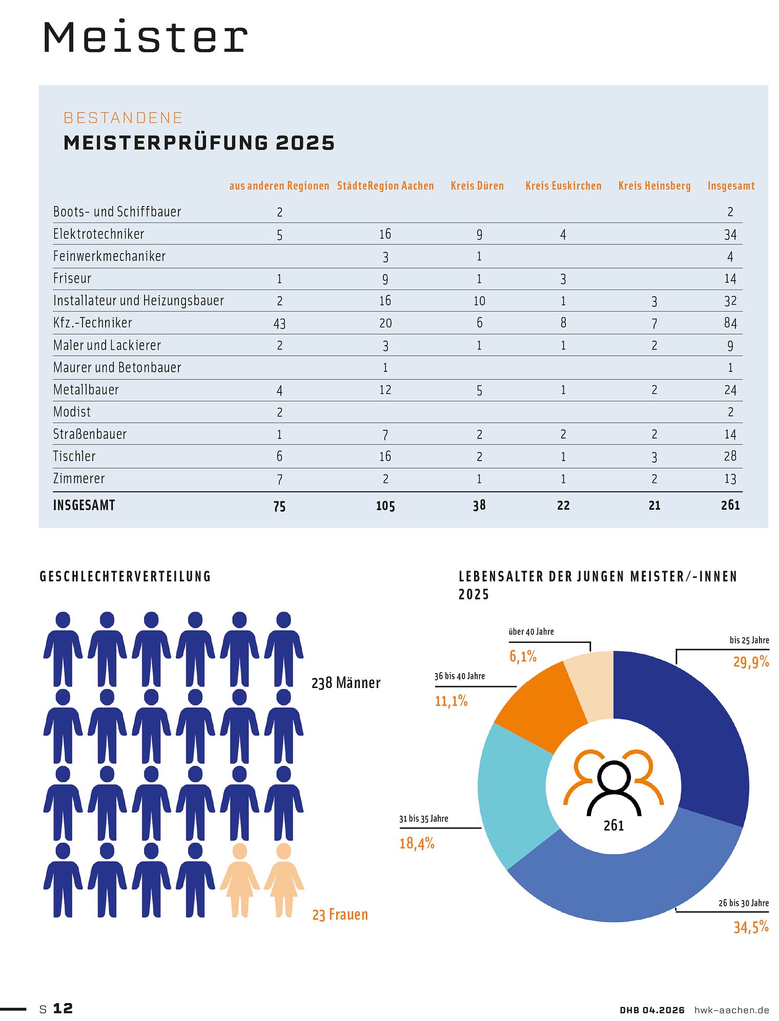 Im vergangenen Jahr beendeten 261 Personen im Kammerbezirk Aachen erfolgreich ihre Meisterausbildung, darunter 23 Frauen. Da der Meistertitel in vielen Gewerken die Voraussetzung für eine Selbstständigkeit ist, beginnen viele Handwerkerinnen und Handwerker bereits nach wenigen Gesellenjahren ihre Meisterschule. Entsprechend sind 30 Prozent der neuen Meisterinnen und Meister jünger als 25 Jahre. Etwa 34,5 Prozent sind 26 bis 30 Jahre alt. Ältere Jahrgänge über 40 sind selten.